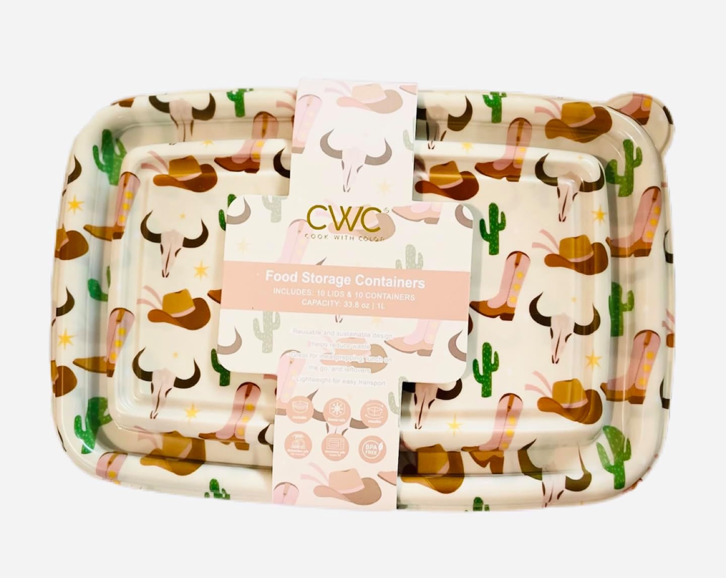 Cook with color 20 PIECE RECTANGULAR FOOD CONTAINERS, 10 LIDS & 10 CONTAINERS Rectangle Shape 9" X 6.4" X 2.4" Meal Prep Containers Airtight Reusable Containers 33.8 Oz / 1 L COOK WITH COLOR colorful storage food containers with colorful lids will add a splash of color to your everyday cooking. The lids are designed with super cute and colorful patters and shapes, pick the style you love for a great addition to your home. Use these for leftovers, meal prep, lunch on the go and so much more. Even use them for gifting home baked goods. Reusable, Stackable containers for food; BPA Free, Freezer Safe, Dishwasher Safe (Top Rack Only), Microwave Safe (Remove Lid). These are safe to use multiple times and will keep your food fresh.