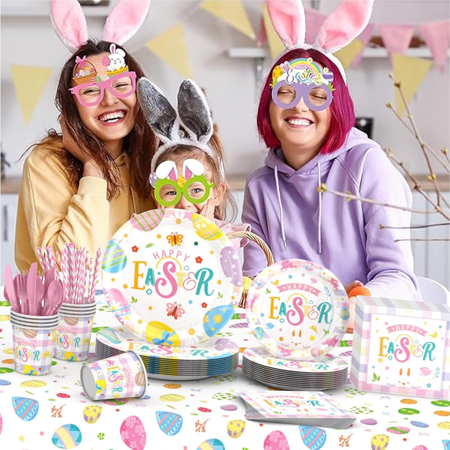 Festive Easter Dinnerware: The all-in-one easter paper plates and napkins party supply includes: 25*9” Easter dinner plates; 25*7” Easter dessert plates; 25*9oz Easter cups; 25*Easter napkins,25*straws; 1 Easter tablecloth measuring 53.9 x 107.9inch; 1 Happy Easter banner. you can easily set up easter party for boys or girls with these easter tableware, tablecloth set