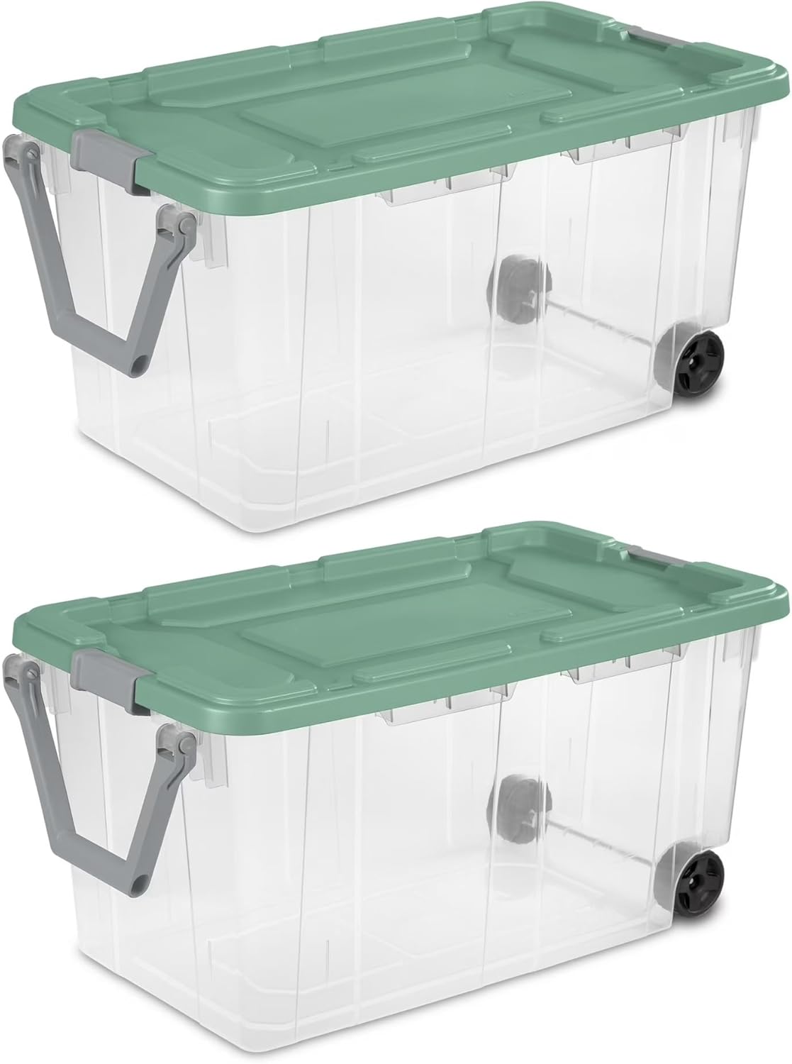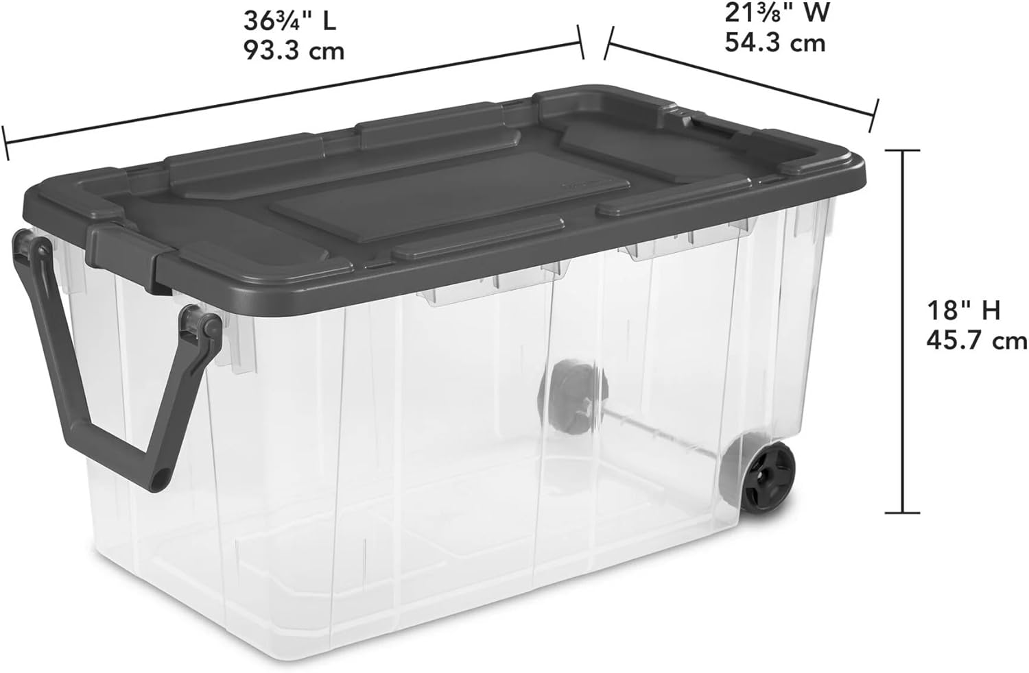 Extra Large 40 Gallon Storage Capacity This 40-gallon (160 Qt) wheeled storage tote set is ideal for storing large, bulky items or organizing multiple items together. Perfect for garage, basement, warehouse, or seasonal storage needs. Set includes 2 storage bins. Durable Plastic Construction Reinforced channeled wall design enhances strength and helps the storage bins maintain their shape under heavy loads. Built for long-term everyday storage use. Easy Mobility with Wheels and Handle Equipped with large rolling wheels and a sturdy metal axle for smooth movement across rough or uneven surfaces. The ergonomic pull handle rotates up for comfortable and easy transport. Secure Lid with Locking Latches Robust non-slip grip latches help keep the lid firmly attached, while the tight-fit, drip-resistant lid offers added protection against moisture and everyday spills. Stackable and Easy to Organize Deep recessed lids allow for secure stacking to maximize vertical storage space. The clear base enables quick identification of contents without opening the lid. Product Dimensions Outside Dimensions: 36 3/4" x 21 3/8" x 18" Interior Dimensions (Bottom): 30 1/2" x 16" x 17 1/8"