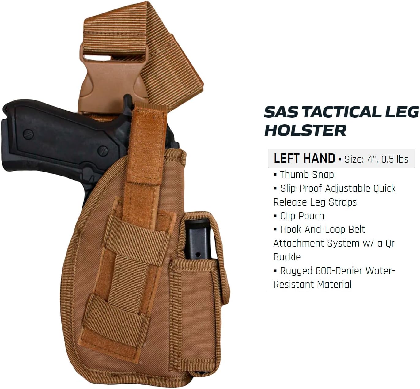 FOX OUTDOOR PRODUCTS SAS TACTICAL DROP LEG HOLSTER: Built for real-world utility and rapid access, the Fox Outdoor Products SAS Tactical Leg Holster is a high-performance solution for left-handed shooters who demand durability, function, and tactical readiness. Designed to fit most full-sized handguns, this drop leg holster offers mission-critical features for shooters, hunters, security professionals, and airsoft enthusiasts alike. The holster includes a reinforced thumb snap retention system, delivering secure pistol hold while allowing for swift draw under pressure. Its adjustable slip-proof quick-release leg straps provide a stable, custom fit for any leg size, keeping the holster in place during high-intensity movement, drills, or field use. An integrated clip pouch offers on-demand access to spare magazines, ideal for rapid reloads in active scenarios. The hook-and-loop belt attachment system with a quick-release buckle ensures fast setup and reliable attachment to any standard duty belt. Whether you're gearing up for a mission or prepping for a training session, the SAS Tactical Leg Holster provides versatile, secure placement for your sidearm. Crafted with rugged 600D water-resistant material, this holster is built to withstand repeated use and demanding environments. From tactical operations to weekend range sessions, the SAS handgun holster delivers professional-grade performance where it matters most.