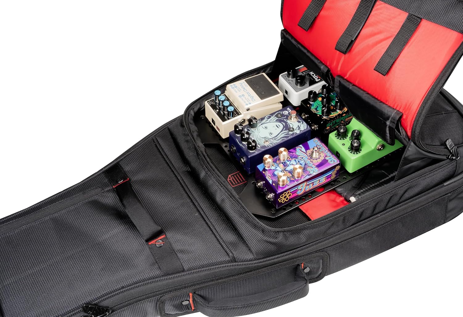 The Gator Cases GPB-POCKETBOARD is a compact, yet rugged pedal board designed to fit in the main pocket of most Gator Cases gig bags as well as other popular brands. (pedal surface is 10.75” X 10.25”) With enough room to hold 6 common-sized pedals or up to 8 mini format pedals this board is perfect for “fly-in” gigs. The built-in handle makes it easy to get in and out of your gig bag pocket and makes travel much easier freeing up your hands that will no longer need to carry your pedal board separately. The 24 gauge (4.3mm) metal has a pedal surface of 10.75” X 10.25” in size and is designed to be configured in landscape or portrait mode.