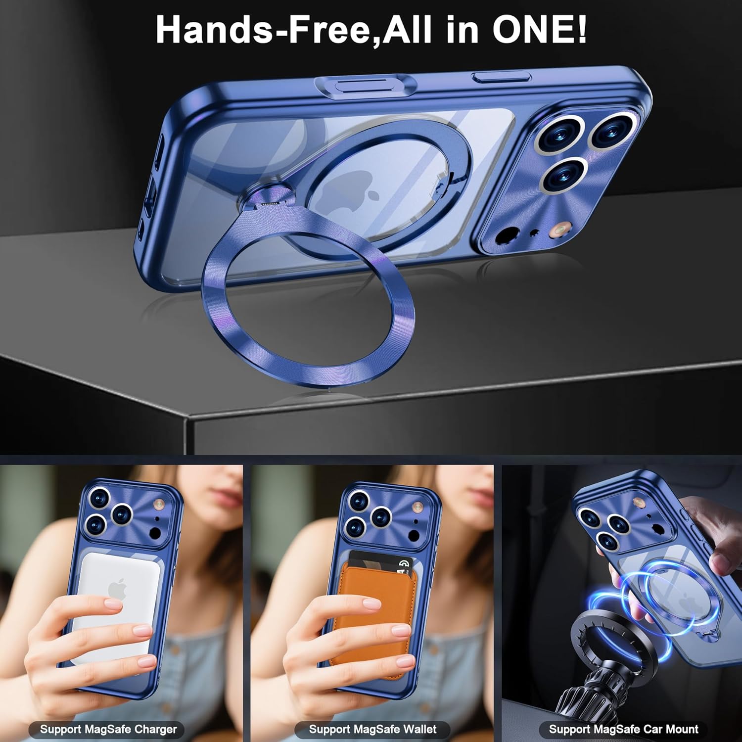 1.Compatible with iPhone 17 Pro Max – Premium Titanium Style & Durability:The electroplated titanium-gold soft frame, which never yellows, restores the official titanium-color metal texture. The thickened crystal-clear back panel has a built-in MagSafe-compatible ring stand and camera protection, making it exquisite, premium, and not bulky. 2.Built-in CD Pattern Metal Ring Stand – Compatible with MagSafe:The built-in CD-pattern metal ring stand is compatible with MagSafe. It supports 120 degrees of stepless adjustment vertically for upright support. The stand itself can rotate 360 degrees, enabling stable support in both landscape and portrait orientations for hands-free video watching and video calls. 3.Full-Metal Camera Protection Armor – The Protective Armor for Your Camera:The built-in CD-pattern metal camera protection armor is made of aluminum alloy. It features precise cutouts for full coverage around the camera lenses. Designed for the large camera module, it effectively prevents scratches, bumps, and stains from daily use. The CD-pattern metal material not only enhances the visual grade but also brings a unique sparkling shine and a 3D sense. 4.Strong Magnetic Experience, Compatible with MagSafe Ecosystem:The ring stand has a built-in strong magnetic core, offering broad compatibility with mainstream magnetic ecosystems like MagSafe. It ensures accurate alignment and a secure attachment. Whether it's a car mount or a magnetic power bank, it provides a reliable connection. It can also firmly stick to any metal surface, such as refrigerators, gym equipment, or cabinets.