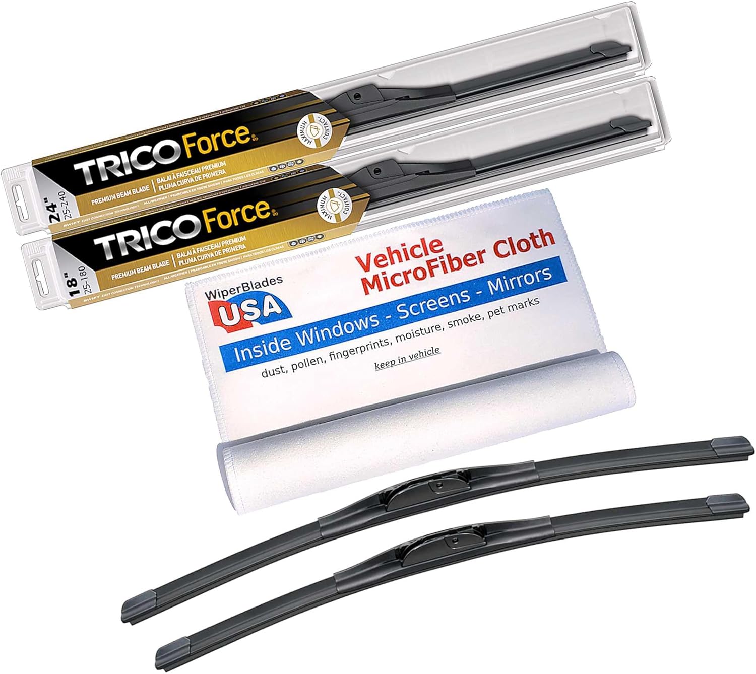 Premium Beam Wiper Blades set +Trico ExactFit Rear wiper. Compatible with Hyundai Santa Fe 2024Trico Force Premium Beam Wiper Blades - "Turning wind force into wiper pressure" These Trico Force Premium Beam Wiper Blades are a great choice and are compatible with your Hyundai Santa Fe 2024 because: When you need "extra" pressure on your wiper blades to keep them stable on your large curved windshield then Trico Force is the premium beam blade for you. Trico Force Wipers are robustly engineered beam blades with a patented swept-wing spoiler that slices through turbulence caused by cross winds, buffeting truck winds and general traffic disturbances. Designed with an innovative aerodesign, these high performance wiper blades control airflow and transfer it into maximum wiper/glass contact for a flawless wipe, providing excellent visibility in all driving situations. VorTec aerofoil converts wind force for maximum windshield contactHighGlide treated rubber element for a smoother, quieter wipeRobust super-structure for durable all-weather performance Memory Curve Steel® beamSWIFT® Easy Connection TechnologyTested to perform over 1.5 million cyclesAnd Trico is the #1 wiper manufacturer in the United States. So you know you can depend on them.