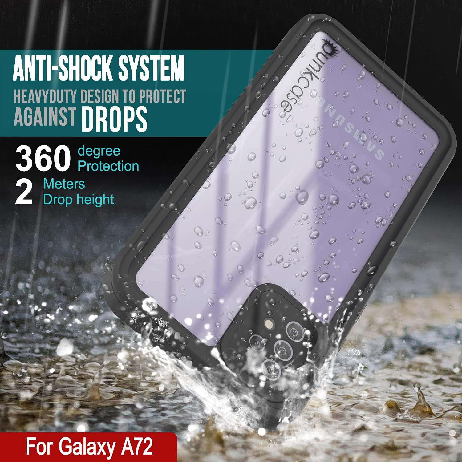 Time to Punkproof your A72 against the Punk Forces of Nature Compatible Model:Samsung Galaxy A72 (6.7") (2021) Thin, Light and Tough: Your PunkCase Extreme case will protect your Galaxy A72 against the seen and unforeseen punk forces of nature. Key Features Include: - Waterproof: IP-68 certified - submersible up to 20ft - Shock & Drop Proof: Military-grade ruggedness - protect your A72 from falls up to 6.6ft - meets or exceeds current ML STD 810F-516 regulations - Dirt & Dustproof:Advanced Sealing Protection blocks dirt & dust from clogging your ports - Perfect Cut-Outs: Uncompromised access to all buttons, ports and jacks following your A72 precision lines - Unparalled Sound Quality: Innovative waterproof sound membranes for crystal-clear communications - Ultra Slim Fit: Slick & sleek design without the bulk - Wide Variety of Colors: Showcase your A72 in one of eight available Extreme color variations Like all PunkCase products your Extreme Galaxy A72 case comes with a LIFETIME EXCHANGE WARRANTY. So...what are you waiting for? Click the 'Add to Cart' button now to punkproof your Samsung Galaxy A72 once and for all!