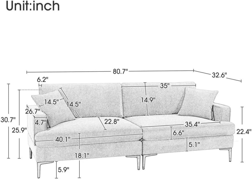 Comfortable Seating: The sofa is designed to comfortably accommodate 2-3 peoples, providing ample space for you and your guests to relax and unwind. The thick and plush seat cushions offer exceptional comfort, allowing you to sink in and enjoy a cozy seating experience.Stylish Iron Legs: The sofa is supported by sleek iron legs, adding a touch of sophistication to its overall design. These legs not only provide stability but also complement a variety of interior styles, making it a versatile choice for any decor.Enhanced Support: The sofa features armrests and cushions with piped edges design, adding a stylish touch and prevent discomfort from sharp edges.Moderate Armrest Width: The sofa is designed with an optimal armrest width, striking the balance between comfort and functionality.Thick Seat Cushions: The sofa's seat cushions are thoughtfully designed to be thick and plush, providing a luxurious seating experience.Fabric Material PolyesterFrame Material Plywood wooden frameLeg Material MetalSeat Fill Material Foam+Pocket springSeat Construction Sinuous SpringsBack Fill Material PP CottonIncludes: (1) Sofa(no other presentation items included).Notice:1. Due to manual measurement, please allow 2-3% error, before you bid, please make sure you don't mind.2. The color may vary due to different displays, please refer to the actual product.2. Due to the manual measurement, please allow a 1-3 cm difference......