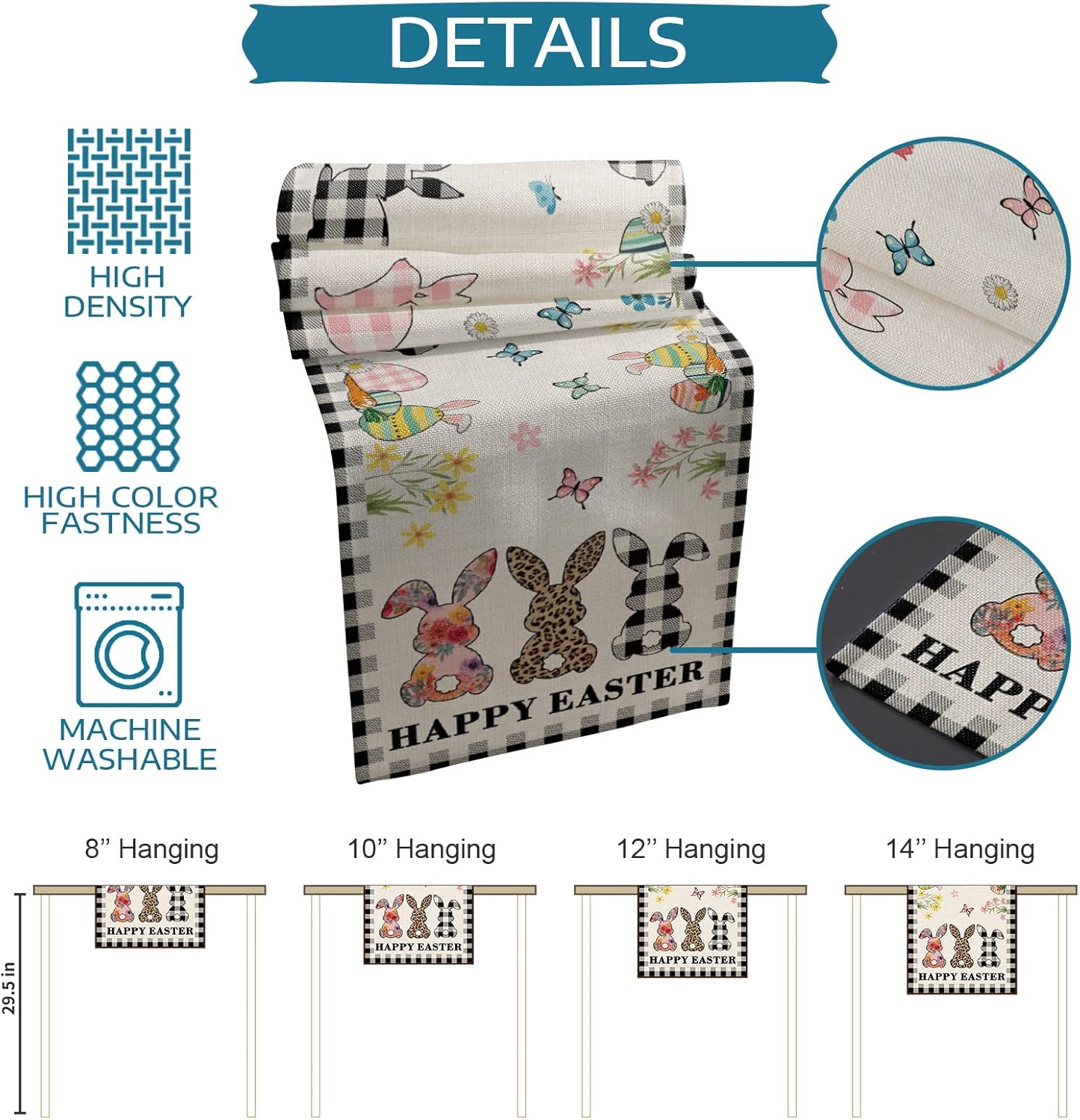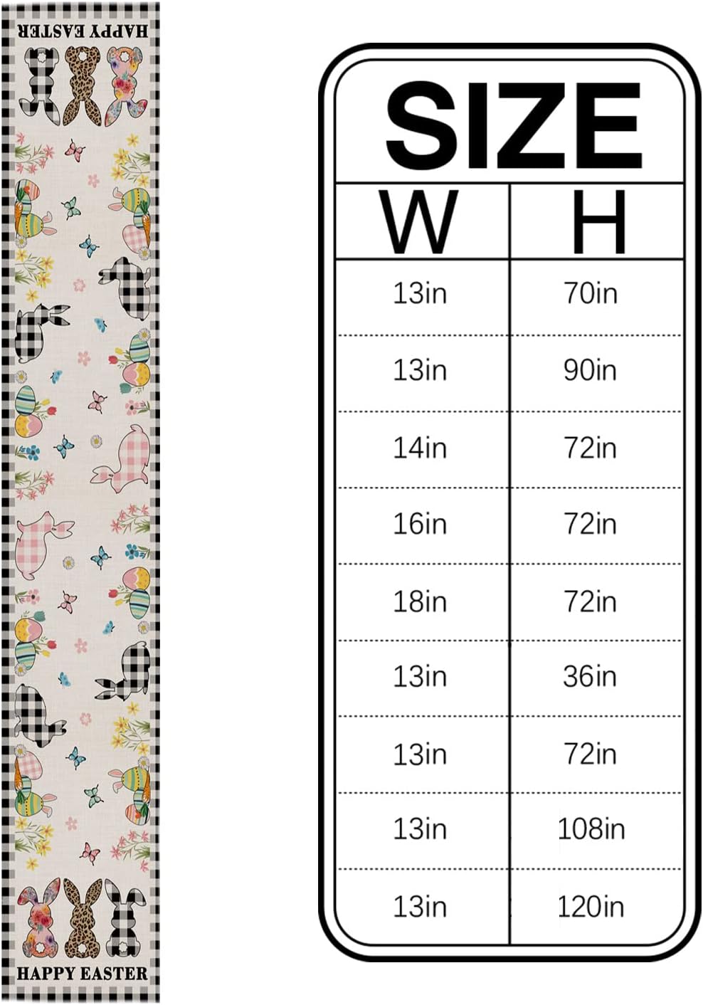 Product description:What will you received:One Easter Rabbit Black and White vivid print table runnerHow to clean it?Machine wash with a laundry bag, do not use bleach, iron with low temperaturesPerfect decoration:Ideal to match your placemats, tableware, dinnerware, give the dining area or other place your use the table runner a real pop of color and farmhouse attention NOTE:The item may arrival with a little wrinkles because it folded to fit in the package, will need ironing or hang 2-3 days before placing on table