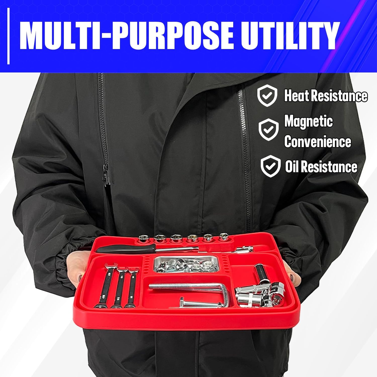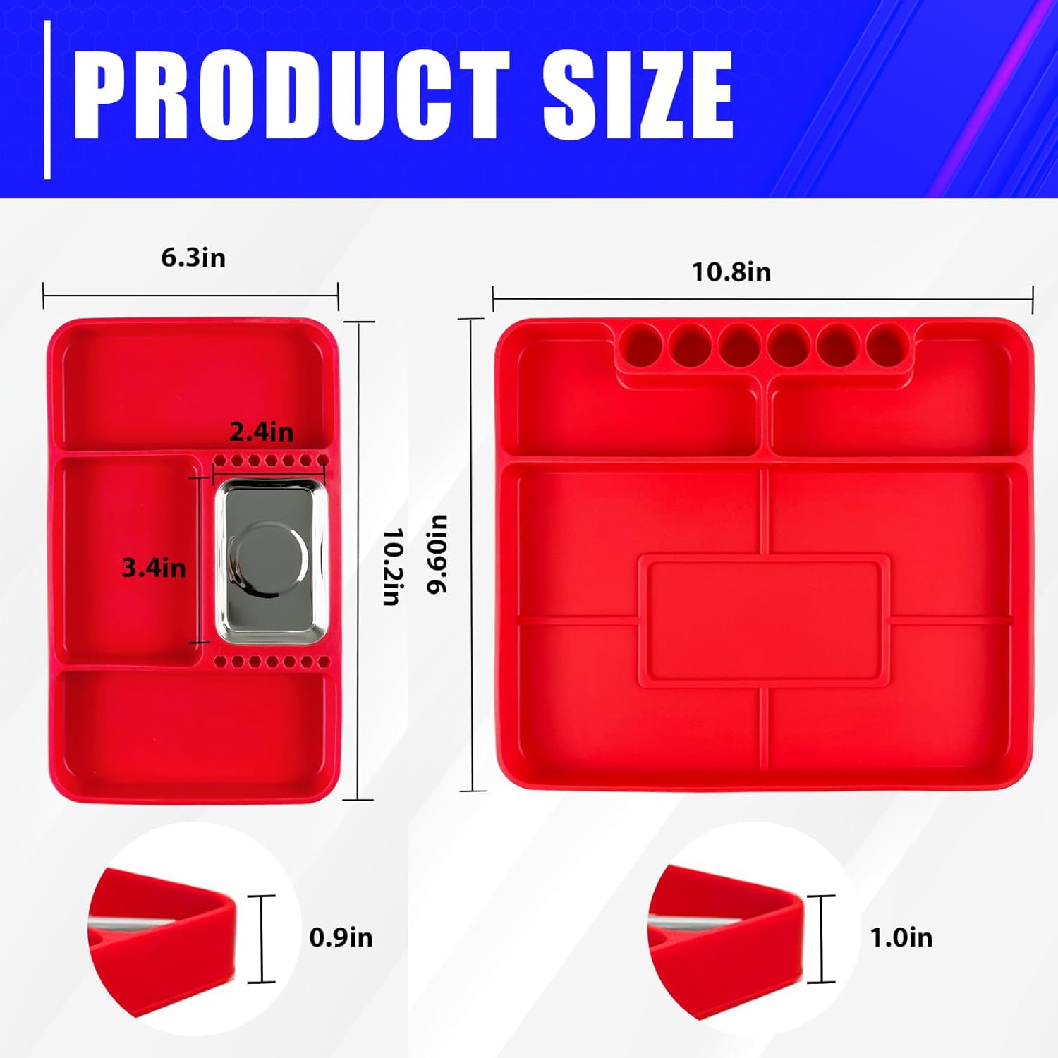 Features: Magnetic Design: Our premium silicone tool tray features a removable magnetic organizer mat, designed to securely hold small metal parts. Say goodbye to lost screws and bolts, and make your mechanical repairs more efficient than ever. Premium Material: Our non-slip flexible tool tray is made of high-quality anti-static silicone, ensuring rust resistance and durability. Simply clean it with water or a little cleaner to keep it looking brand new. Prevent Slipping: The silicone material used in our tool tray prevents it from slipping, ensuring that your tools and parts are protected and stay in place. Its flexible feature also allows it to remain stable even on uneven surfaces, without scratching your workplace. This versatile tool tray set is perfect for various working environments, including cars, house renovation, aircraft, boats, motorbikes, and electronic products. It's the ultimate choice for keeping your tools organized and easily accessible. Package Include:2 x Silicone Tool Tray