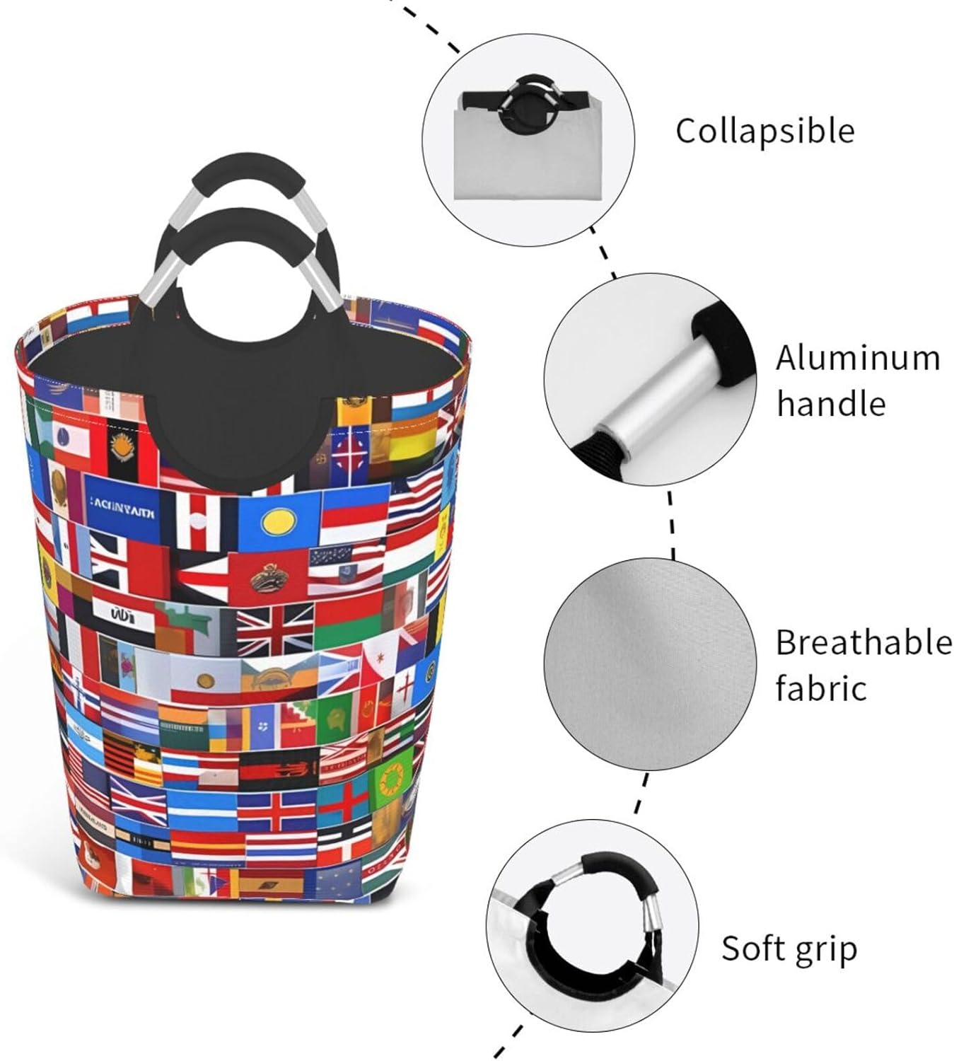 This Various flags square dirty clothes storage bag is mainly made of polyester, which is light and flexible, and can maintain a stable shape even under heavy pressure and collision. At the same time, the introduction of Oxford cloth material greatly enhances the durability of the product, and it is resistant to wear, bumps and pulling. In terms of design, it adopts advanced leak-proof technology, combined with waterproof coating and precision sewing technology to effectively prevent moisture penetration. The exterior uses cutting-edge transfer technology, and the bottom is supported by PE board to ensure stable load-bearing and does not tip over. Its large-capacity design can easily accommodate winter clothes, daily clothes and sundries, and is easy to carry and store. After folding, it can be tightly placed in the gap of the suitcase. The equipped aluminum handle is sturdy and durable, and supports hanging, which is convenient for placement in various places.