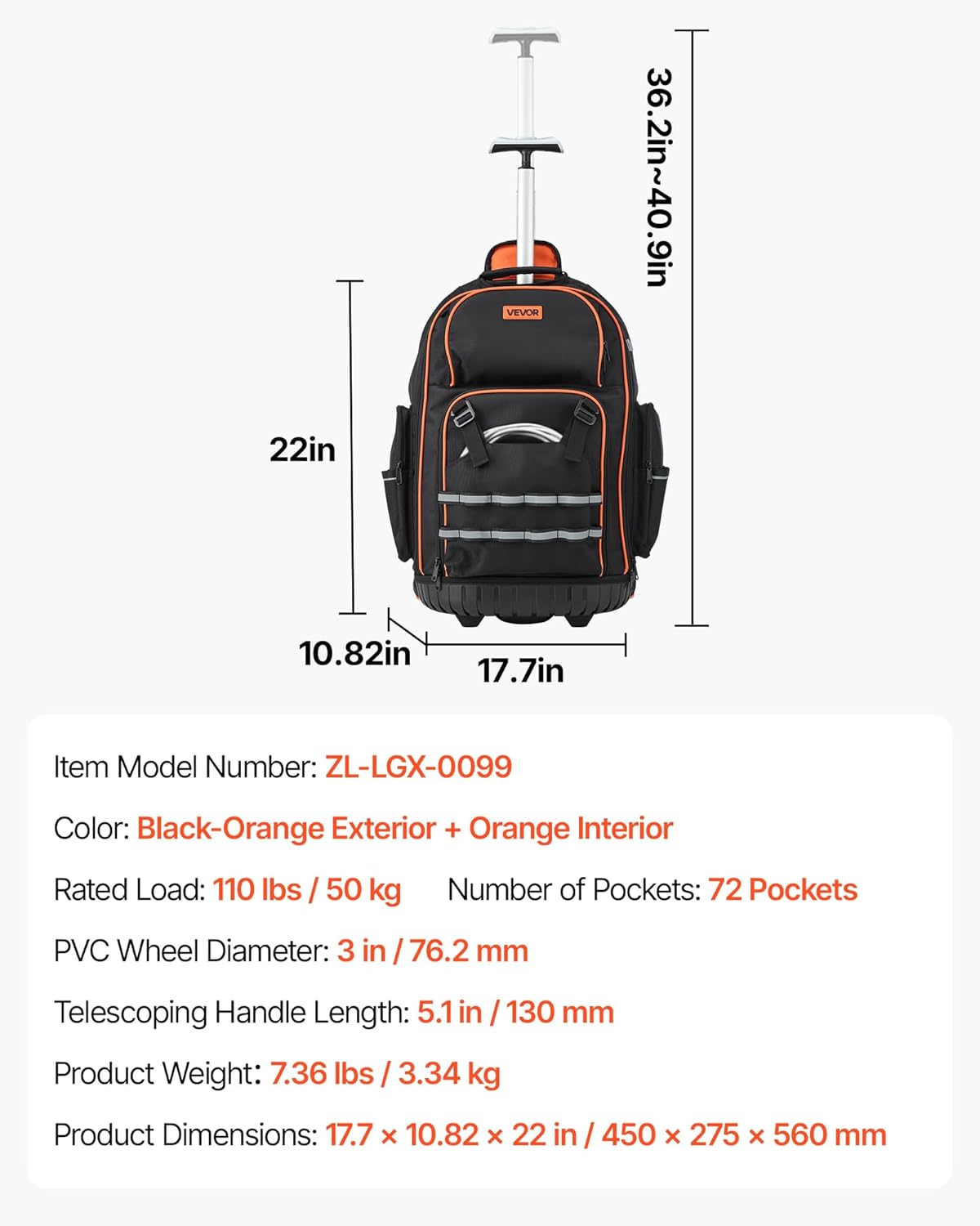| Item Type Name | 110 lbs Load Capacity, 72 Pockets Heavy Duty Roller Tool Bag on Wheels, Adjustable Telescoping Handle & Stable Base, Toolbag Organizers for Construction, Mechanic |